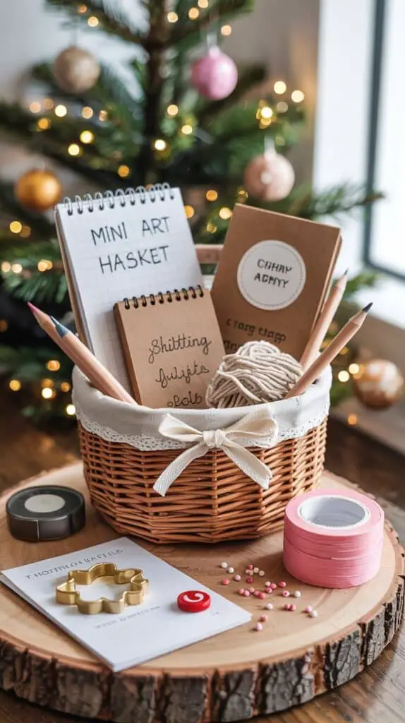 Think sketching, knitting, journaling, or even baking. Choose a tiny theme and stick to it. For example: a mini art basket might include small coloured pencils, a tiny sketchbook, and washi tape. A baking basket could have a Christmas cookie cutter, sprinkles, and a recipe card.