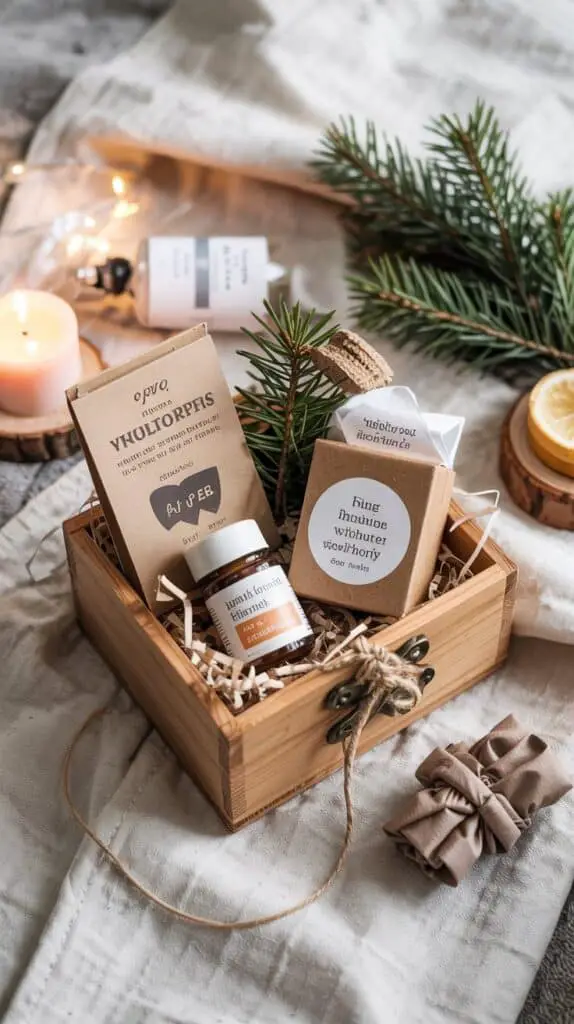This little basket is perfect when you want something that feels caring without going over budget. Start with a small wooden box or a shallow kraft tray and add simple wellness bits—like a mini herbal tea packet, a small jar of honey, a pocket-sized hand cream, or even a cute little inhaler balm. You can tuck in a pair of soft gloves or a tiny scarf scrunchie if you want to make it feel extra winter-friendly.