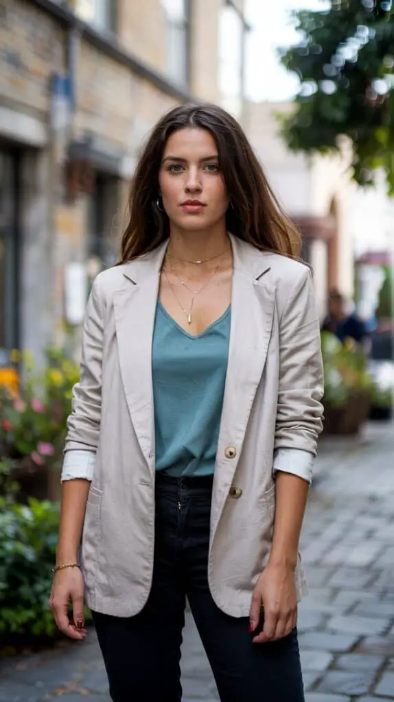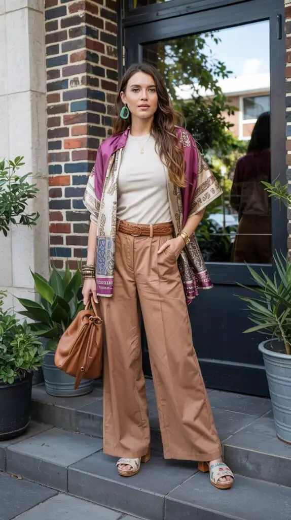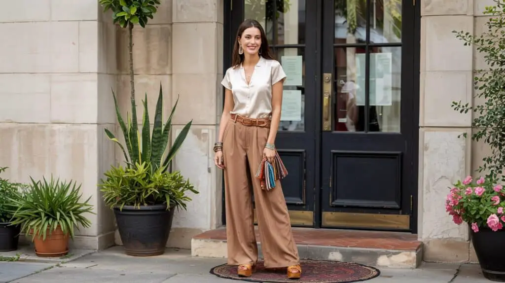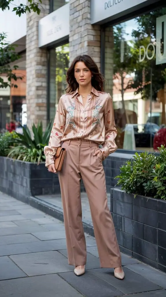This combination feels feminine, artistic, and perfectly office-appropriate. It’s especially great for women who want a “bohemian work outfit” that still feels confident and put together.