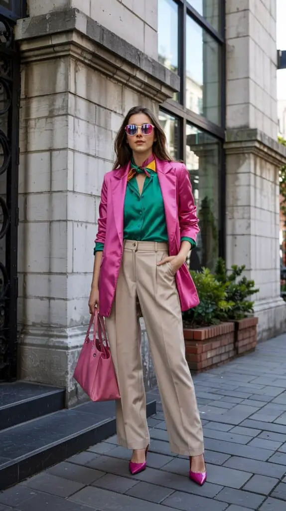 Imagine an emerald blouse with beige trousers, a raspberry cardigan with black tailoring, or cobalt accessories over a simple cream top. These small vibrant touches feel fun and expressive while still staying business-friendly.