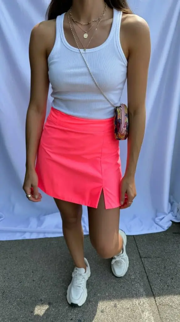 Neon green with denim? Yes. Hot pink with a relaxed white button-down? Absolutely. Orange skirt with a simple ribbed tank? Perfect. These outfits feel summery, fun, and surprisingly effortless.