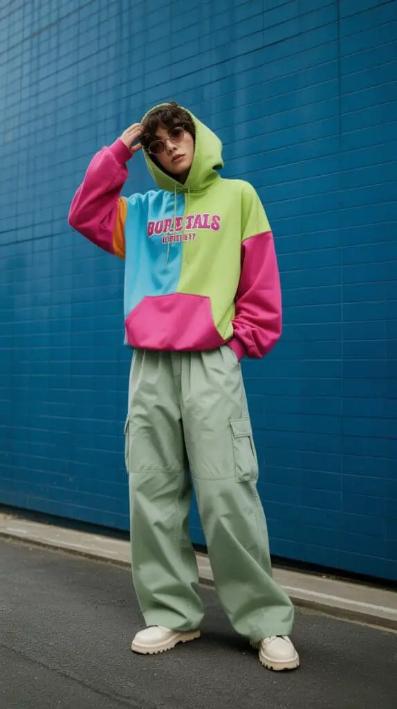 Oversized streetwear is having a moment, and the 2026 version is all about bright, happy colours. Start with baggy bottoms — wide-leg trousers, slouchy cargos, or loose parachute pants in a soft pastel or a bold primary tone.