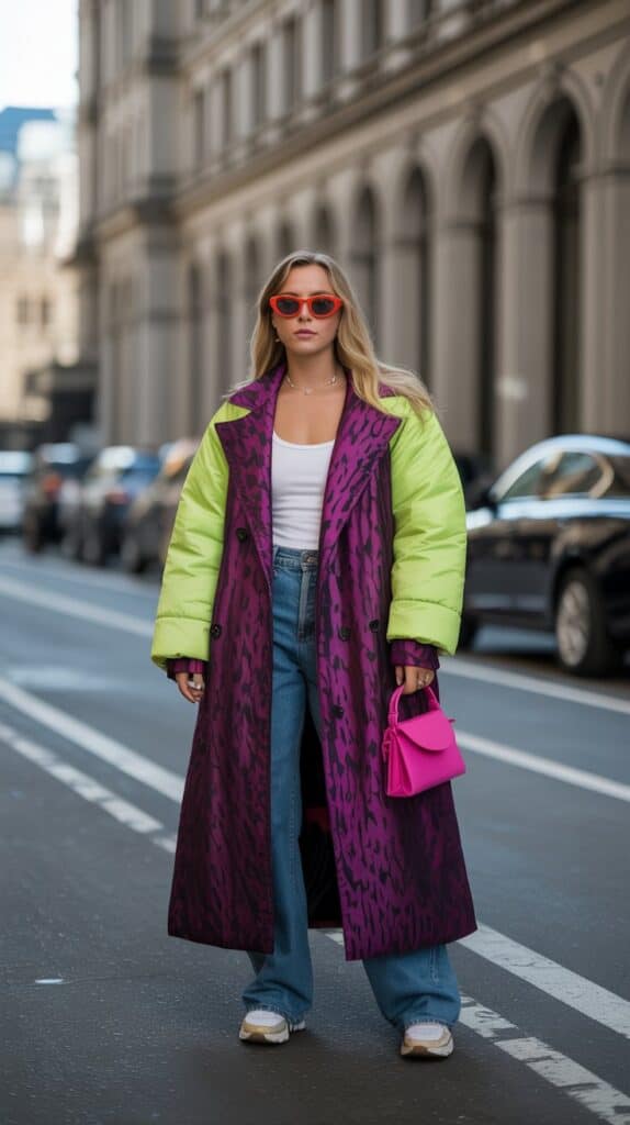 Even in warm seasons, a statement coat is one of the easiest ways to build a bold fashion outfit. Choose something dramatic: a long patterned coat, a bright trench, a neon puffer, or a textured jacket in something fun like emerald or plum.