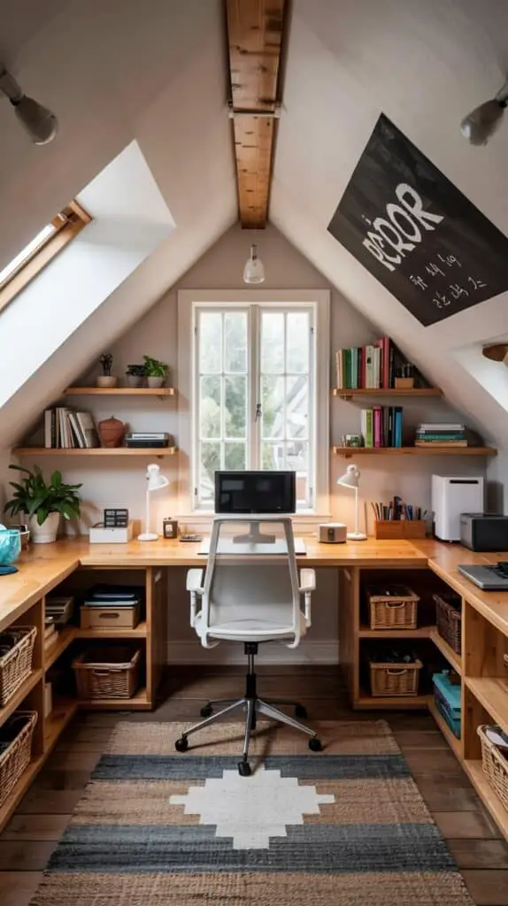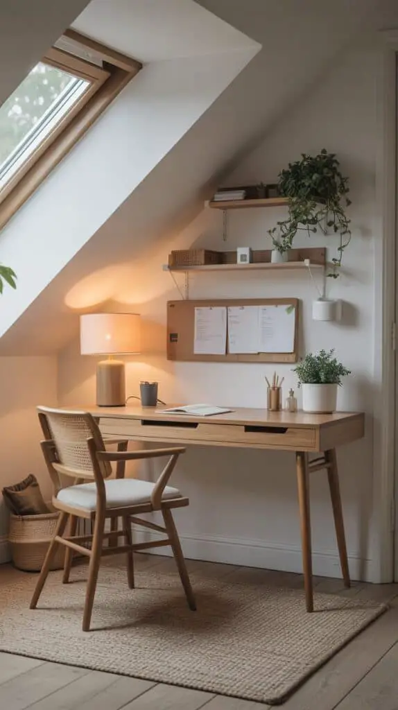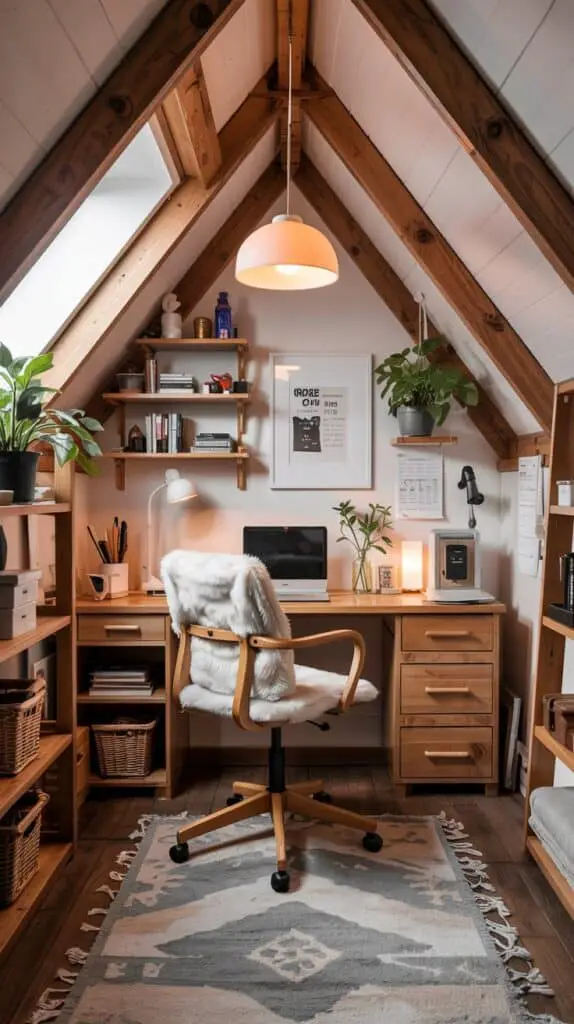 This setup works especially well if your attic has a long wall with a consistent slope, because it gives you a clean background for video calls and makes the space feel intentional. Add a small shelf above the desk or a pegboard for quick storage, and suddenly you have a neatly tucked-away workspace that feels calming rather than cramped.