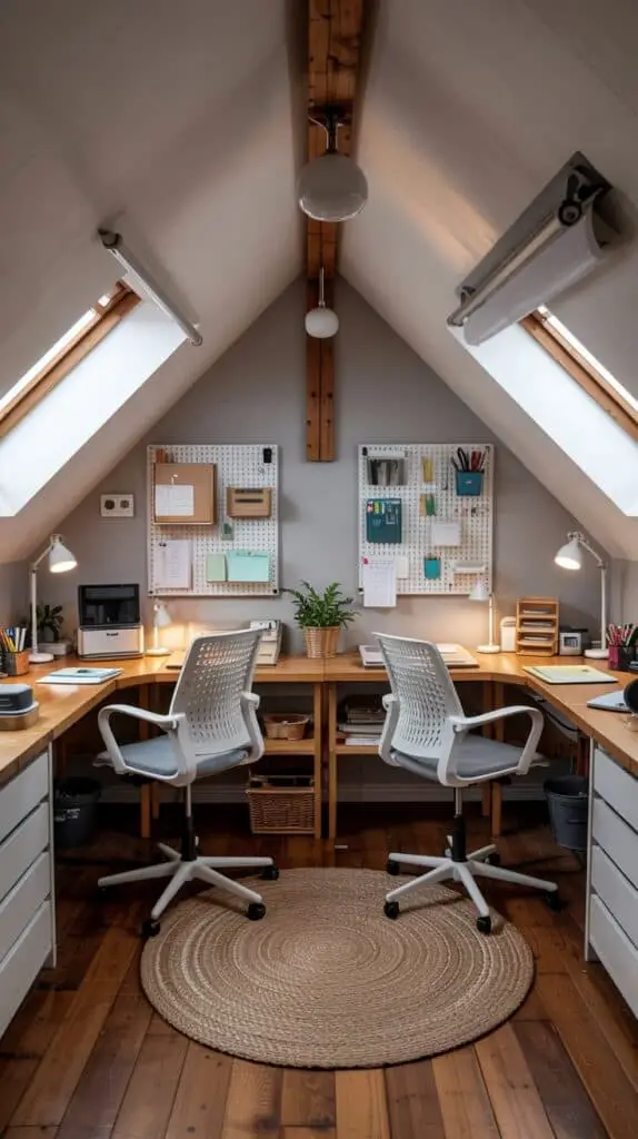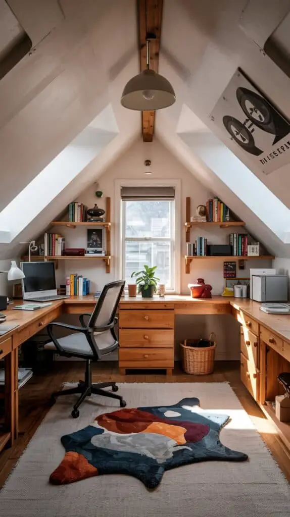 If you share your home with a partner who also works from home (or kids who randomly need to “do homework” near you for emotional support), a dual attic workspace can honestly save your sanity. The trick is to place the desks on opposite walls so nobody feels like they’re breathing down each other’s necks. Use slim desks or even wall-mounted shelves as worktops to keep the centre of the attic open. Add individual lamps, little storage units, and separate pinboards so each person has a personal zone.