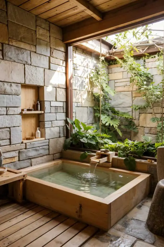 A Japanese soaking tub—also known as an ofuro—is more than a bathtub. It’s a space designed for stillness, warmth, and immersion. Unlike Western tubs, ofuros are deeper, more cocoon-like, and often complemented by nature views. The design you described, featuring natural stone walls, a wooden tub, exposed beams, and a window opening to lush greenery, is the very definition of a serene nature bath. It creates the illusion of bathing outdoors while keeping the cozy intimacy of an indoor space.