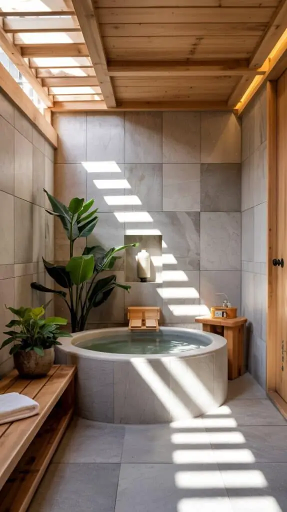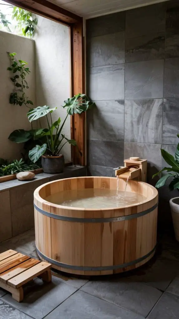 A Japanese soaking tub turns a daily activity into a spa ritual. The nature elements work together to create a peaceful sensory journey: