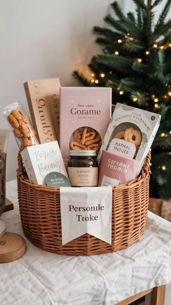 A gift basket doesn’t need to be overflowing. Choosing a small container helps keep costs down and makes the gift feel curated rather than random.