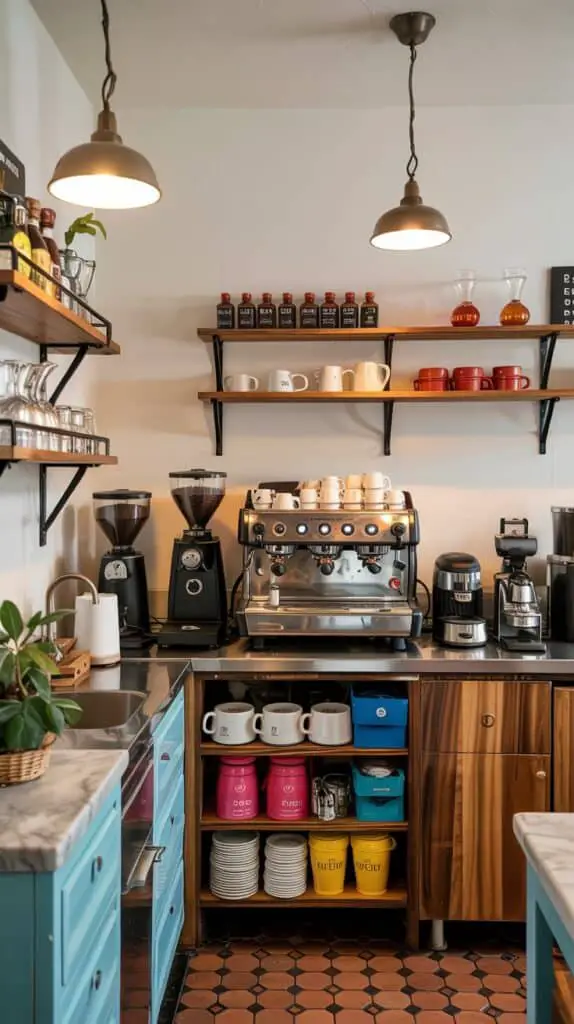 Natural light is a bonus, but if that’s not possible, use layered lighting: under-cabinet LEDs for task work, pendant lights for ambience, and recessed spots for general illumination. Good lighting makes a compact coffee shop kitchen feel intentional rather than cramped.