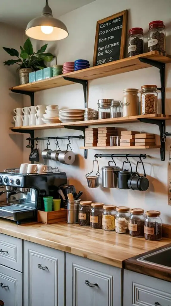 If you’re leaning into a cafe style kitchen look, paint the shelving in your brand colours or opt for warm woods to soften the industrial edge. Glass jars of coffee beans, loose-leaf tea, or even biscotti not only store well but also add to your coffee shop decor ideas list.