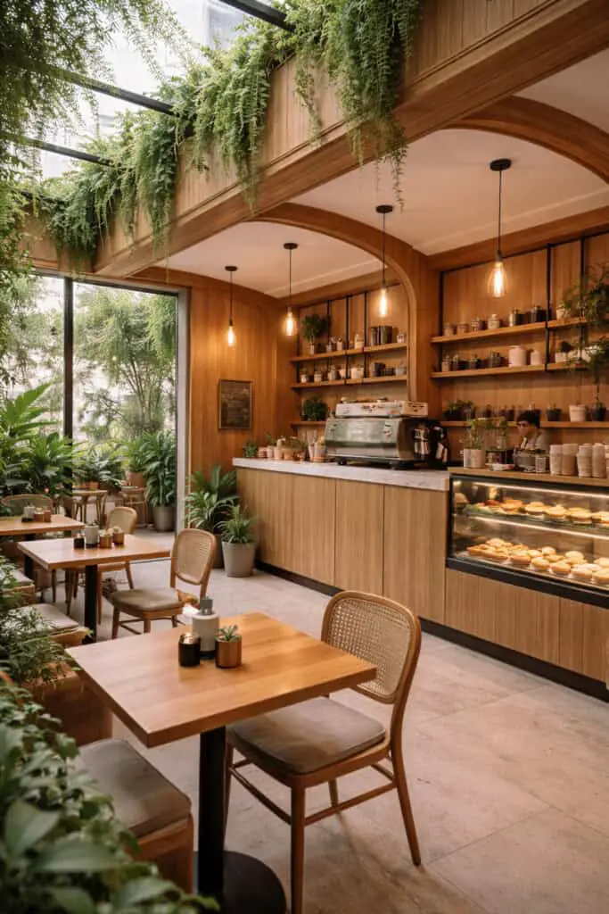Natural wood paneling, curved beams, and clean-lined furniture keep the interior grounded. The balance of minimalism and texture is key. In cozy cafe interior design, wood replaces excessive decoration, making the space feel warm without feeling busy.
