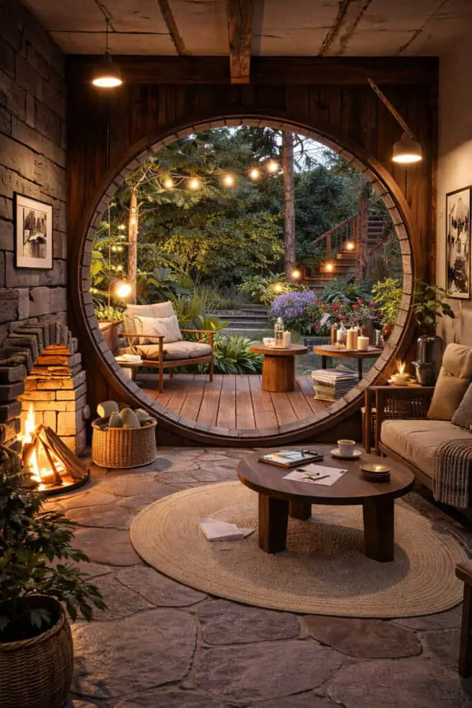 A large rounded window overlooking trees or greenery instantly defines a Cozy Cafe Interior. Instead of artwork, nature becomes the focal point. In modern coffee shop design, framing the outdoors creates calm and visual depth — especially in small cafe spaces.
