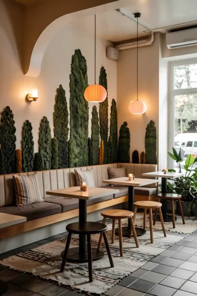 Low seating areas with plush cushions, small round tables, and built-in benches create comfort within a minimal layout. A Cozy Cafe Interior benefits from intimate zones that feel almost residential — like a home cafe aesthetic inside a coffee shop design.