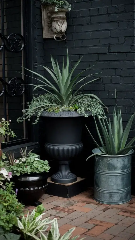 Look for planters in matte black, charcoal, deep green, or aged terracotta. If you already own mismatched pots, paint them the same color (a single can of exterior paint can unify a whole set). For a gothic greenhouse feel, mix in one or two pieces that look old-world: a weathered urn shape, a simple pedestal, or a vintage-style zinc tub.
