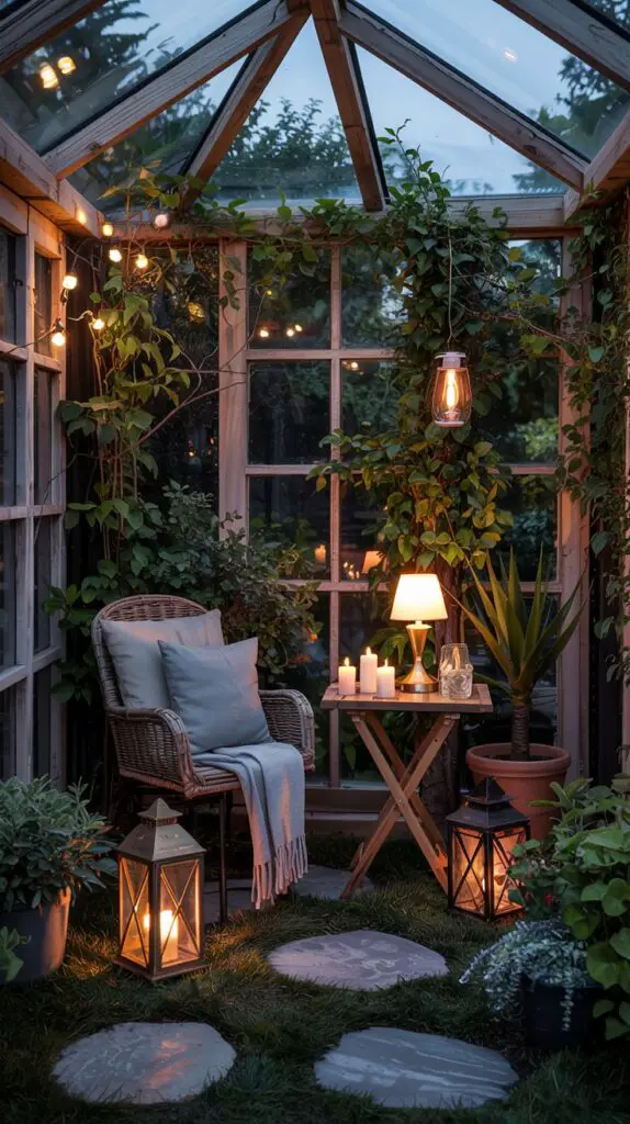Lighting is where the moody garden becomes a place you actually want to sit at night. You’re not aiming for bright patio lights—you want a low, warm glow that feels like a gothic greenhouse at dusk.