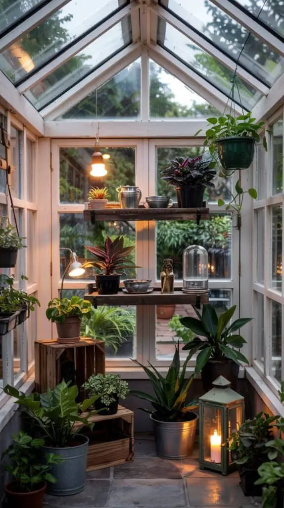 A gothic greenhouse is more of a feeling than a structure: glass, condensation, shadows, and plants layered at different heights. You can fake the vibe with one corner.