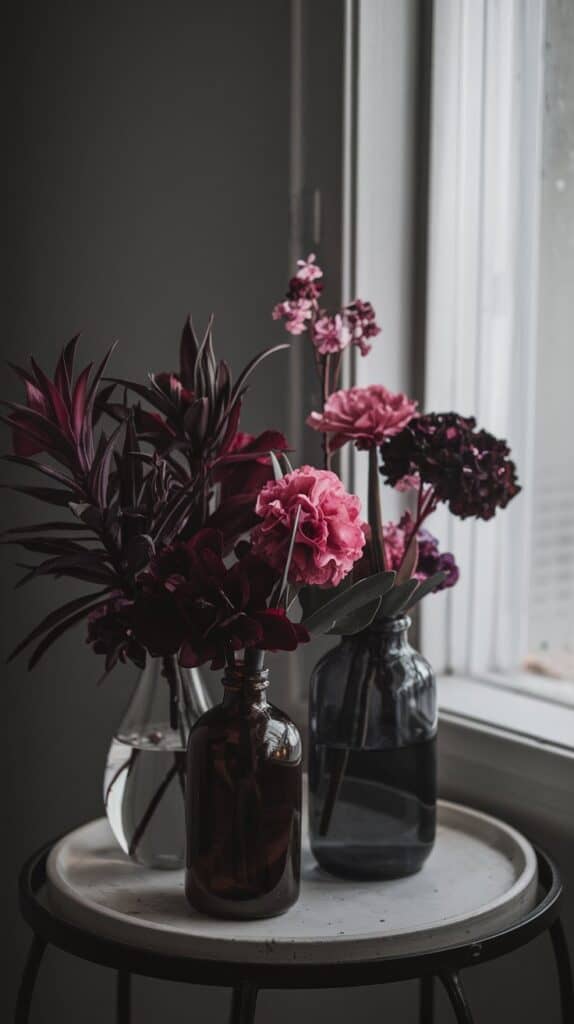 Cut flowers can help you stay budget-aware. Instead of buying lots of flowering plants, buy one small bouquet occasionally and place it in a dark glass bottle on your table. It gives you that “gothic gardens in bloom” feeling without committing to finicky plants.