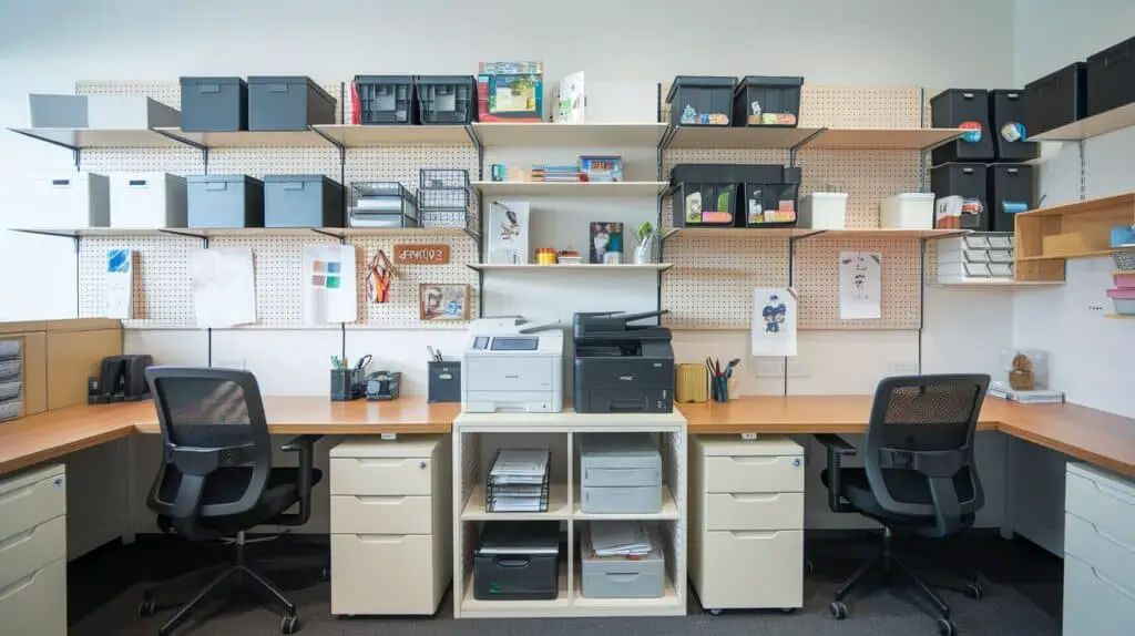 - Use shared shelves or cupboards for things like printer paper and stationery.