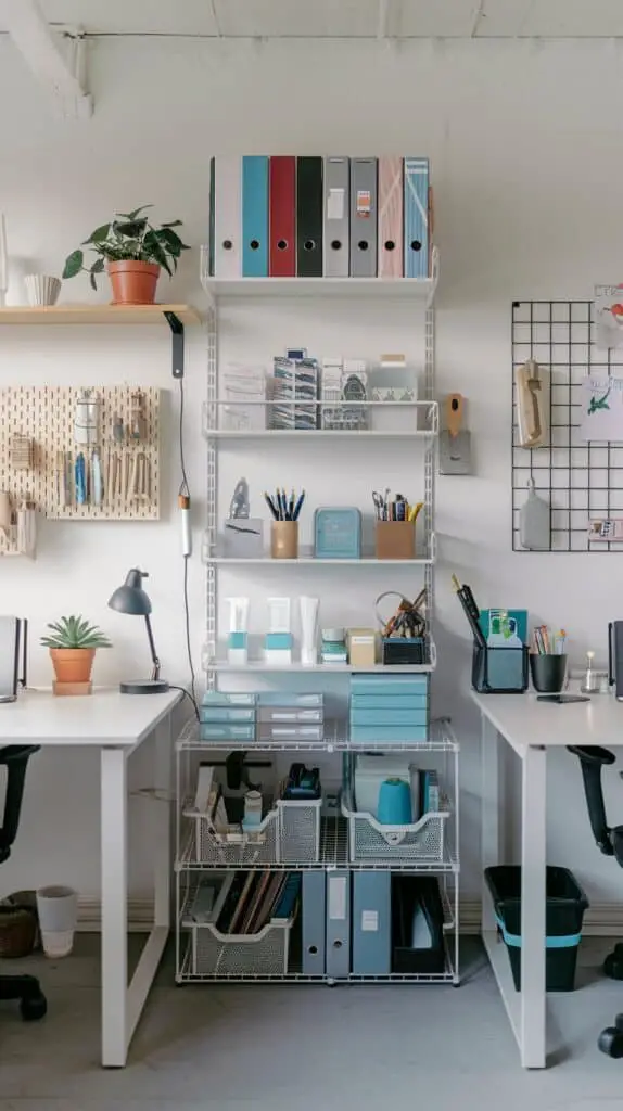 If you’re short on floor space, use the walls—floating shelves, pegboards, or wall grids can hold supplies without taking up valuable desk space.