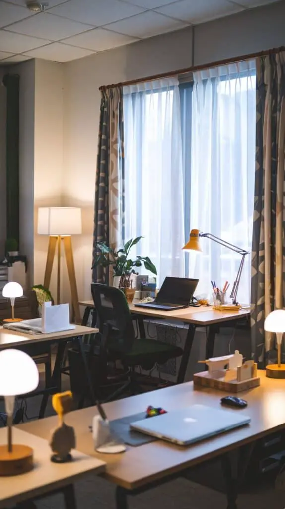 Good lighting makes a big difference to how comfortable and productive you feel. If you can, set up your desks near a window for natural light. If not, make sure there’s a mix of general lighting and personal lamps so you can both adjust your own space.