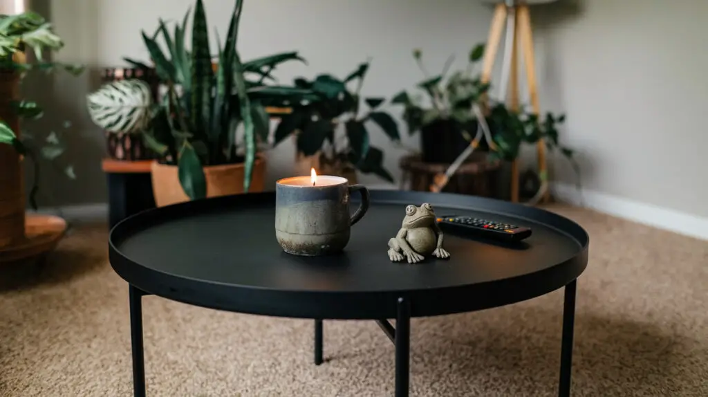 This might be an unpopular opinion, but I don’t think your coffee table needs to be Pinterest-perfect. Mine usually has at least one mug, one half-burnt candle, and something totally random like a tiny stone frog from my cousin’s wedding. And you know what? That’s the charm. Black coffee tables are dramatic by nature—so let them hold something weird or personal too.