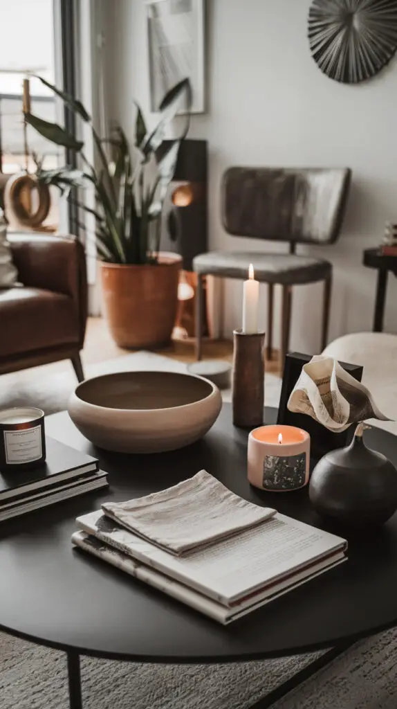 Try a cream or white ceramic bowl as a centerpiece, or a stack of light-toned coffee table books with fun covers. If you’ve got a black table basse or something sleek and modern, add in a chunky knit runner or linen placemat underneath your decor—it softens everything instantly. I love using clear glass candle holders or a pale plant pot to brighten things up without losing that luxe, dark-table look.
