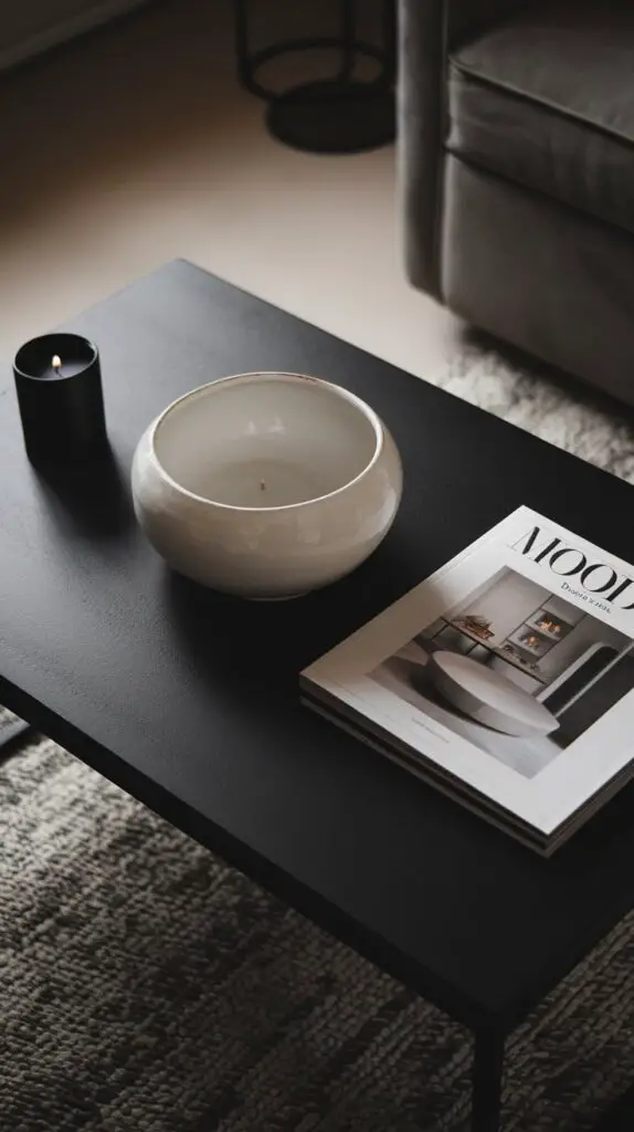 Try a cream or white ceramic bowl as a centerpiece, or a stack of light-toned coffee table books with fun covers. If you’ve got a black table basse or something sleek and modern, add in a chunky knit runner or linen placemat underneath your decor—it softens everything instantly. I love using clear glass candle holders or a pale plant pot to brighten things up without losing that luxe, dark-table look.