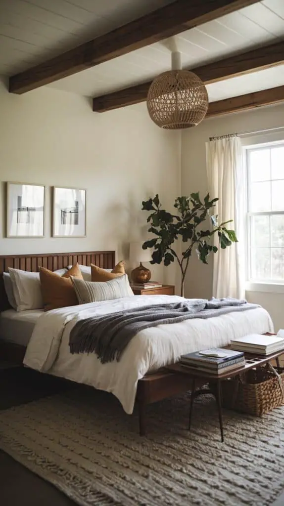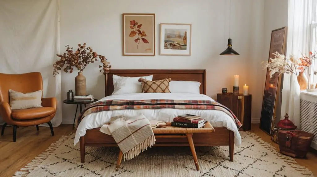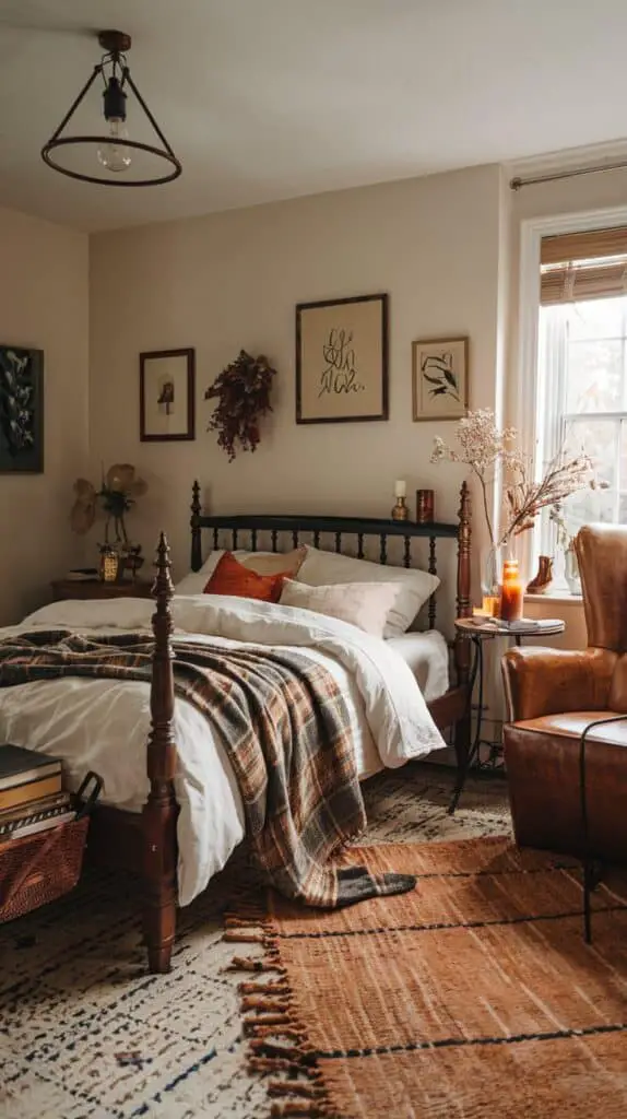 A worn rug or checked wool blanket can tip it toward “vintage master bedroom” vibes without feeling fussy. And if you’re after that autumn aesthetic (who isn’t?), dried florals or a little orange-toned bedding detail go a long way. Just remember — you’re building a space to rest, not to impress, so let it feel like you.