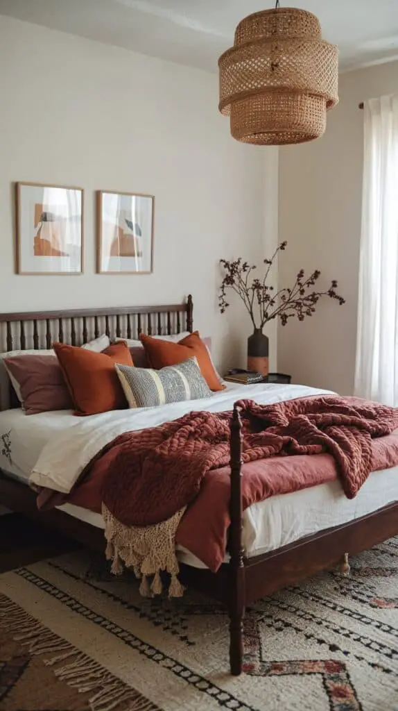 If your frame’s dark wood, try mixing in creams or a faded floral for some softness. Add at least one deep-coloured throw — knitted, quilted or even slightly boho — and oversized pillows that feel like you could disappear into them. A vintage-style quilt folded at the end of the bed instantly makes it feel homey, even if the rest of the room is minimal. This is where that “cottage bedroom with a hint of fall” thing really starts to happen.