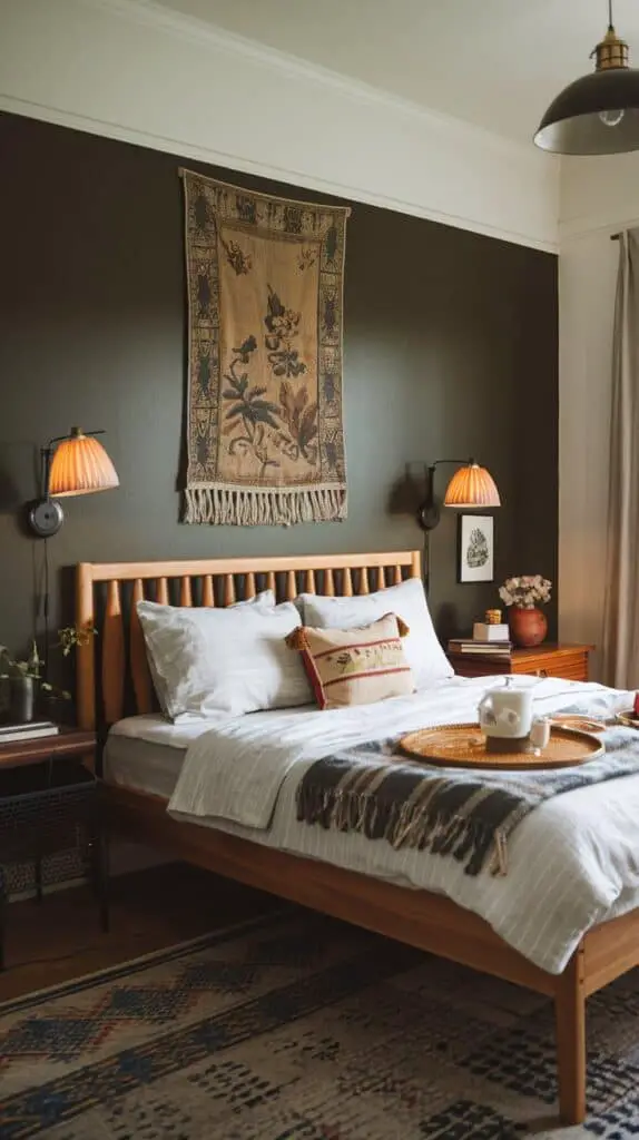 Dark green or brown paint, a hanging tapestry, or vintage art can anchor the bed in the room without making it feel too cluttered. Try simple nightstands in mismatched wood or even metal, and don’t worry if they’re not symmetrical — the charm is in the mix. Add one or two warm lights — a wall sconce and a small bedside lamp with a pleated shade works wonders.