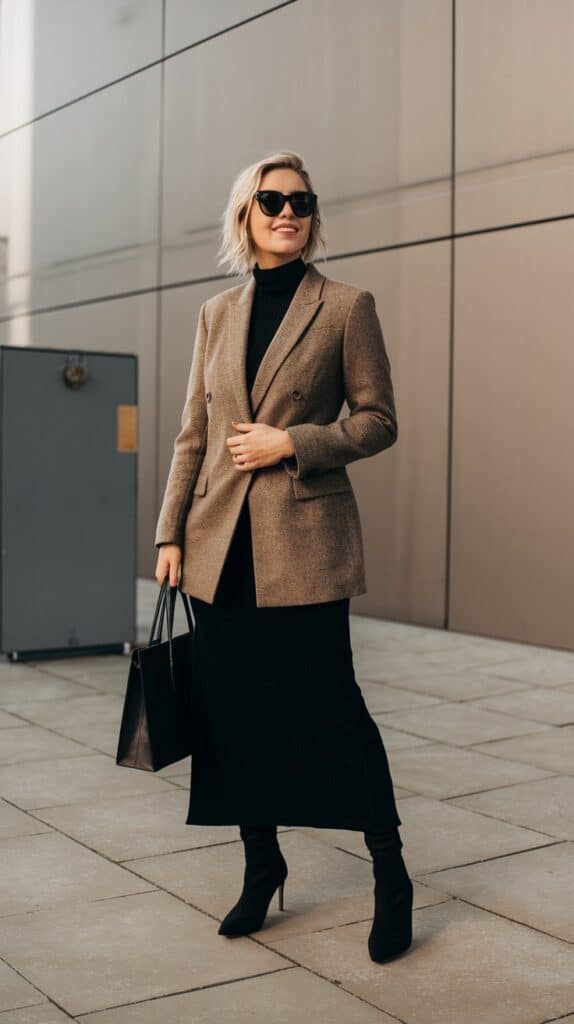 This is my go-to when I want to look like I know what I’m doing—whether I do or not. Pairing a long black dress with a blazer instantly makes the outfit feel elevated. Go for a structured blazer in wool or tweed for texture and warmth.