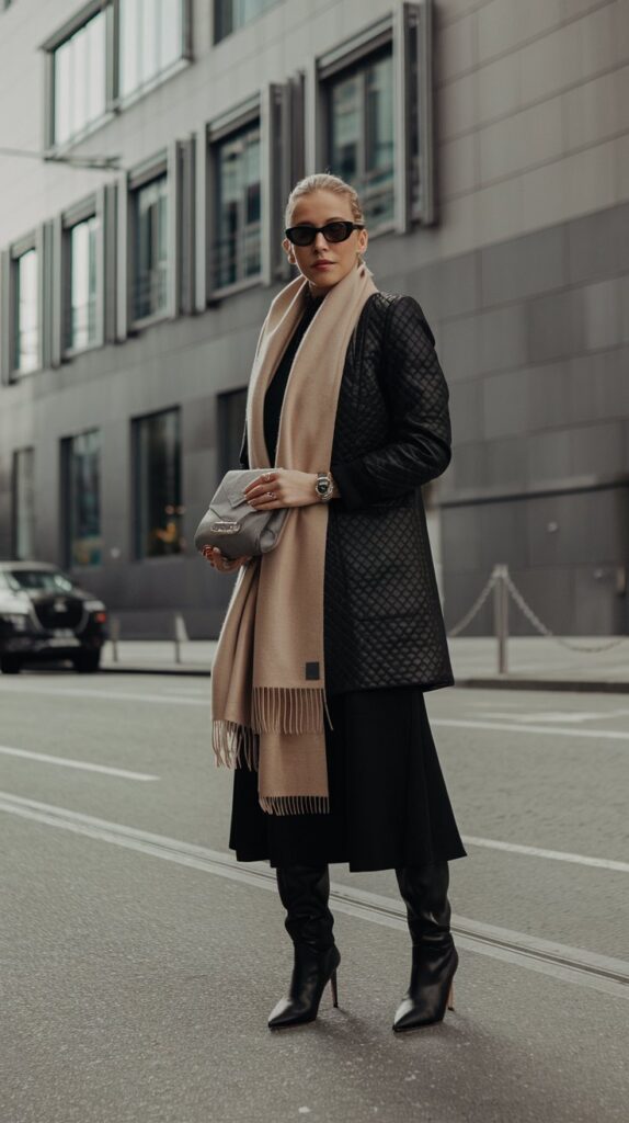 Bonus if you layer a fine-knit turtleneck or thermal underneath. Add a scarf, crossbody bag, and sleek winter boots, and you’ve got a warm and polished long dress with jacket outfit that’ll carry you all season.