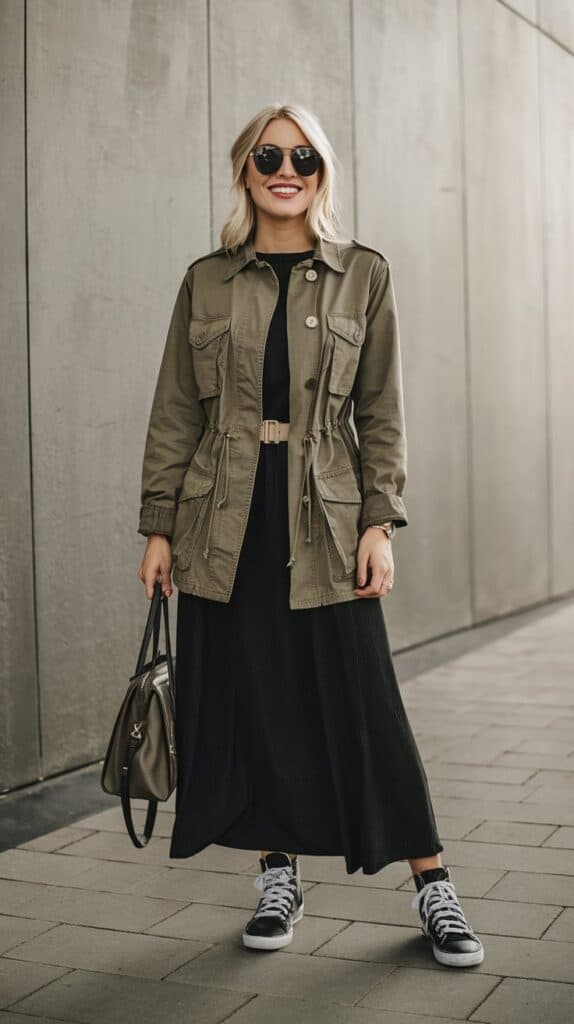 Now hear me out—this isn’t just for cargo pants lovers. A khaki or black utility jacket gives just enough structure and a hint of casual, which is perfect if your long dress feels a bit too formal for everyday. This pairing works best with boots or high-top sneakers and a slouchy bag. You can also cinch it at the waist with a belt to bring in shape.