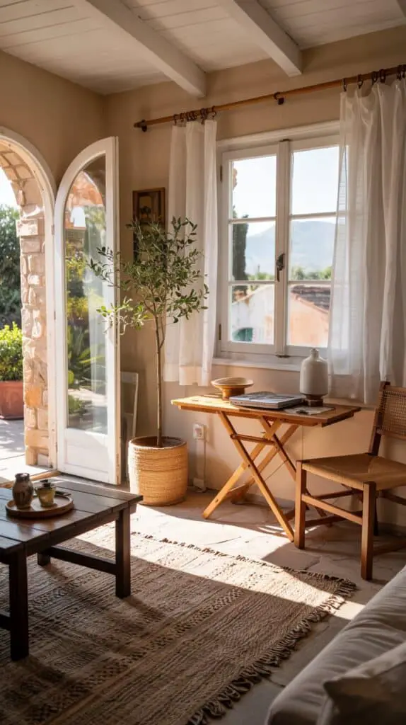 For an even bigger impact, keep the area around windows visually quiet. A single olive tree in a pot, one low bench, or a small café table reads more Mediterranean than a crowded collection of decor. If you want that Mediterranean Inspired Home feel, let the light be the “main character.”