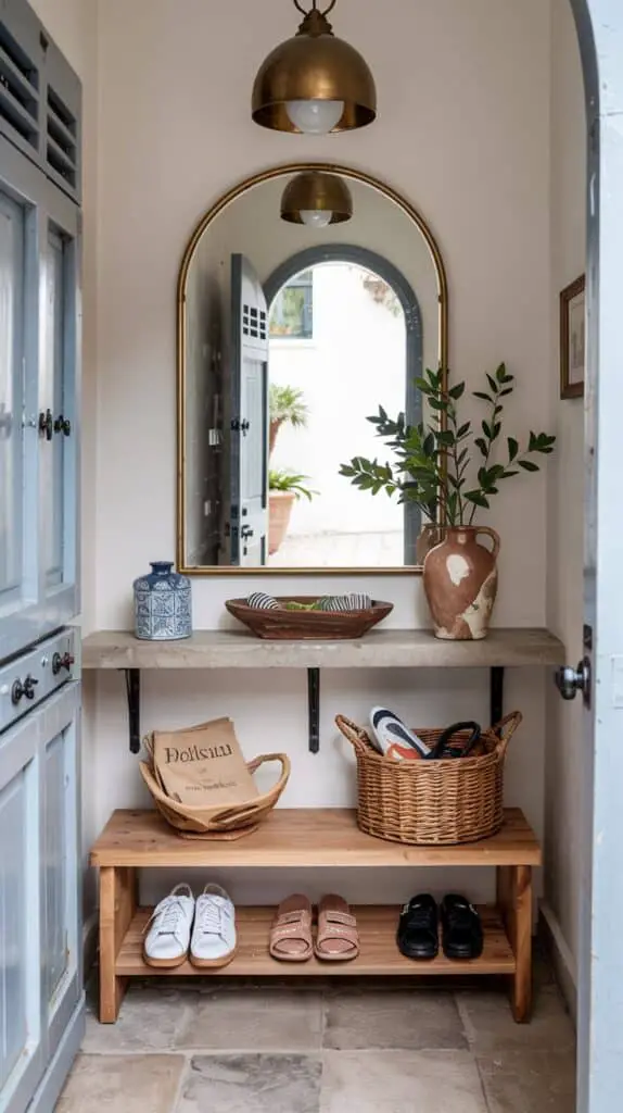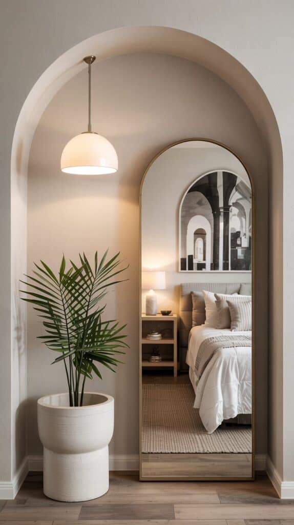 Even softer: use styling to suggest an arch. A tall plant plus a rounded mirror can mimic that curve without being literal. The key is to keep it simple so it feels architectural, not themed.