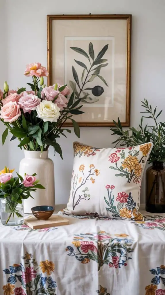 Florals also work through pattern. A single floral pillow, a small framed botanical print, or a tablecloth with a soft motif can bring that courtyard garden energy without adding extra objects.