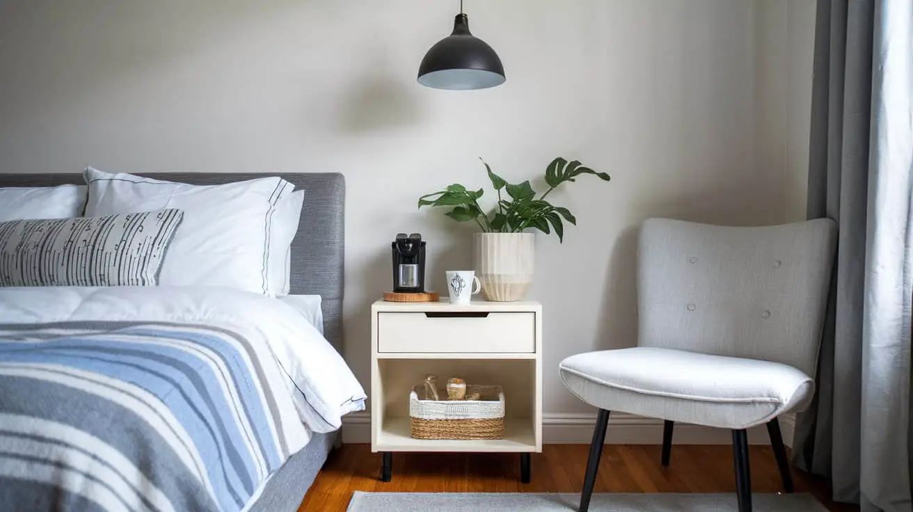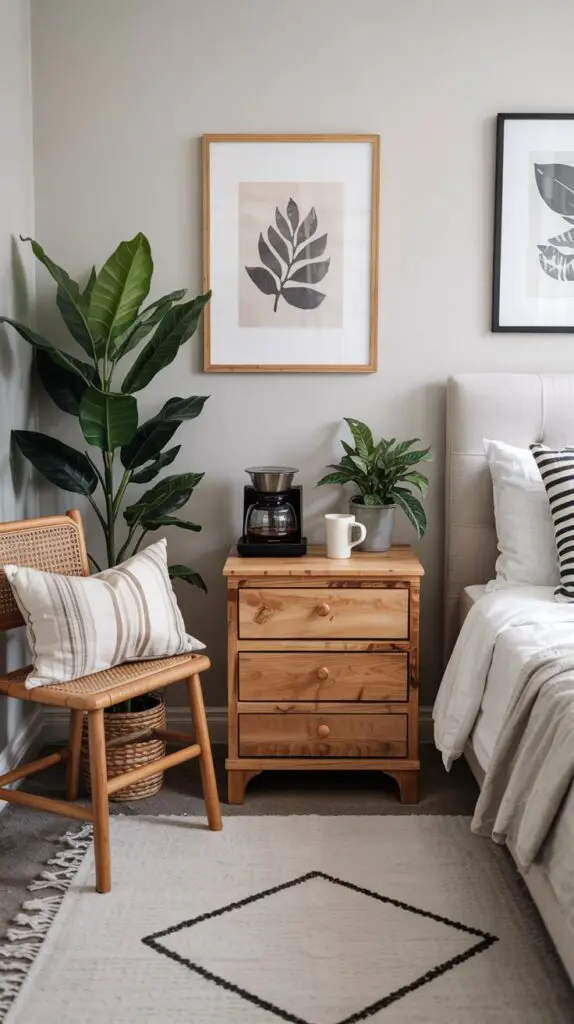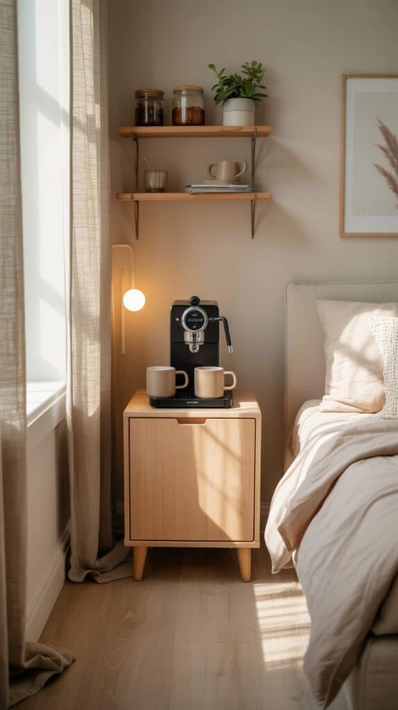 A narrow cabinet or console at the foot of the bed is one of my favourite layouts. It keeps the coffee station visually separate from where you sleep, which somehow makes the room feel calmer. Add a small lamp, one plant, and store pods or beans inside the drawers so nothing feels busy.