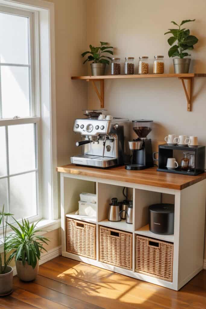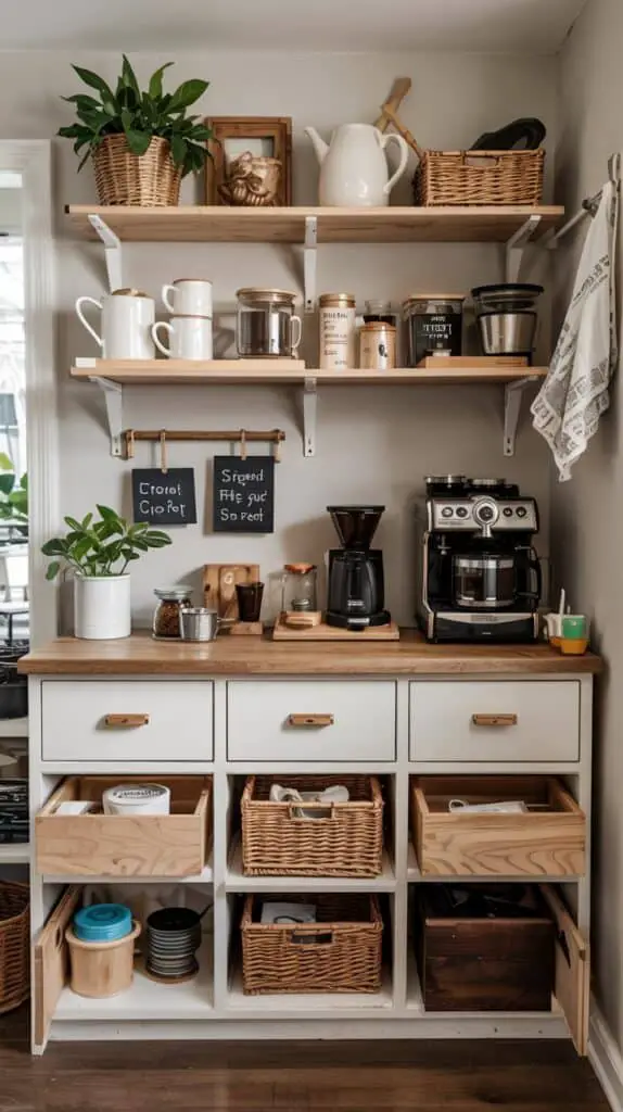 Even the nicest coffee station can feel stressful if it’s cluttered. Drawers, baskets, or closed cabinets help keep everything out of sight. Only the essentials should be visible — mug, machine, maybe one jar. That’s it.