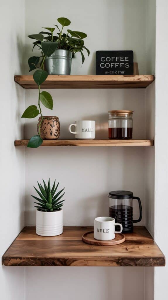 One or two floating shelves above a slim table instantly create a dedicated coffee moment without taking up much floor space. Keep it light: mugs, one jar, maybe a small plant. Avoid over-styling — the goal is calm, not Instagram overwhelm.