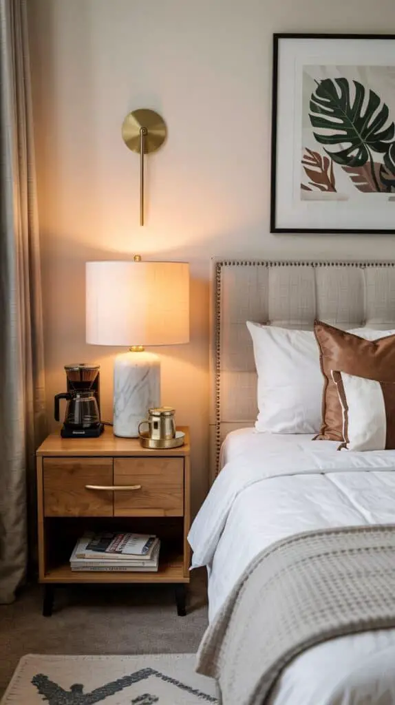 If space is tight, start small. A wooden tray on a bedside table can hold a compact coffee machine, a couple of mugs, and a jar of sugar or stirrers. Keeping everything contained makes it feel intentional instead of cluttered. This works especially well if your goal is “quiet luxury” rather than full café vibes.