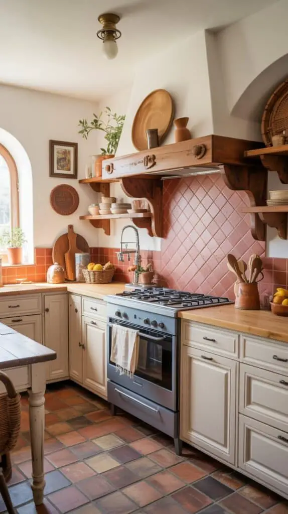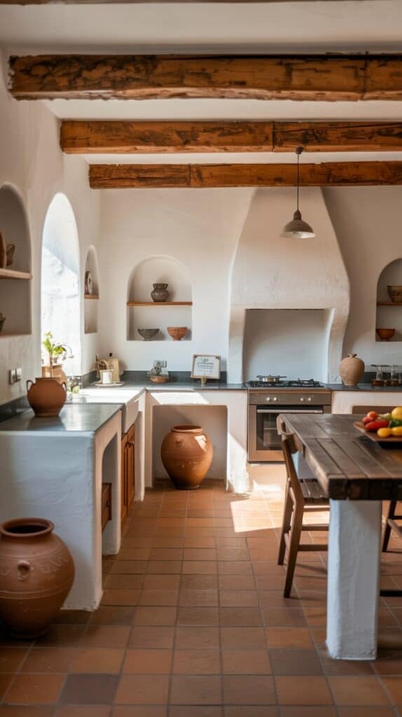 Smooth plaster walls in cream, sand, or soft white keep the space bright. A stone counter like marble, limestone, or soapstone adds luxury without feeling too polished. Terracotta tiles bring warmth and an old-world feel, especially in kitchens with a Spanish villa vibe. Together, these textures make the room feel handcrafted and full of character.