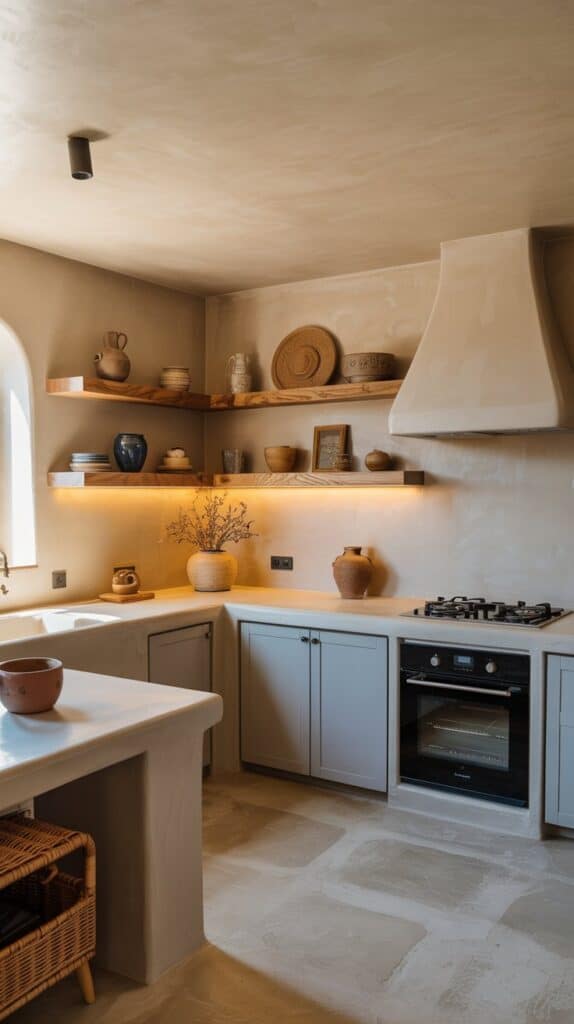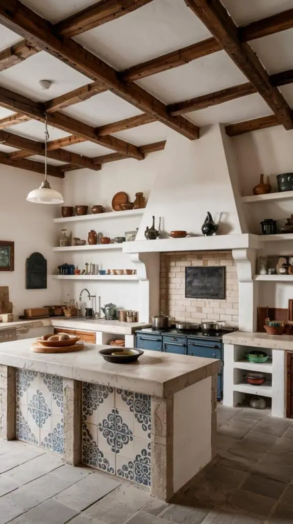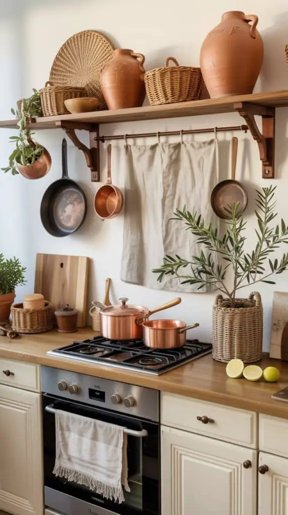 Open shelves displaying ceramic bowls, olive oil bottles, and woven baskets make the kitchen feel authentic and lively. Adding a freestanding wooden island or butcher block counter also brings warmth and practicality to the space.