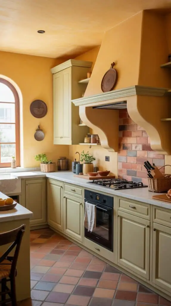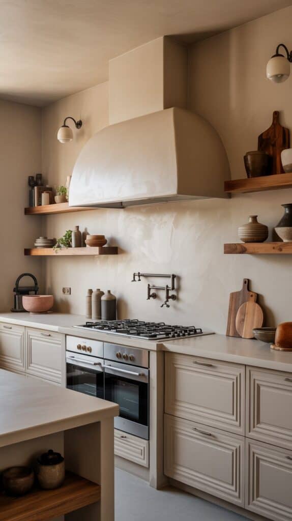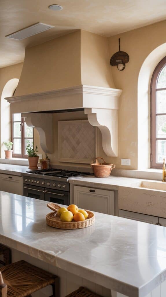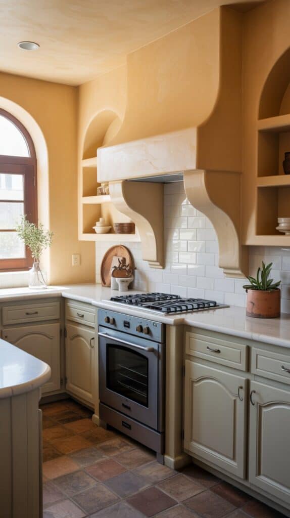 Mediterranean homes often feature arches — over doorways, windows, alcoves, or shelving niches. Adding a small arched opening or softly curved plaster range hood can instantly shift the whole kitchen toward a Spanish or Italian look. Curves soften the space and add classic architectural charm.