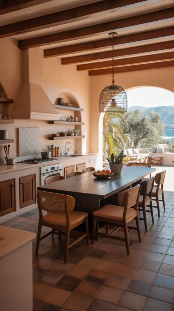 Mediterranean kitchens embody connection. Whether it’s a long wooden dining table, a built-in breakfast nook, or a kitchen island meant for sharing wine and conversation, these spaces nurture togetherness. If your home has room for seating, even a small table, it enhances the Mediterranean charm.