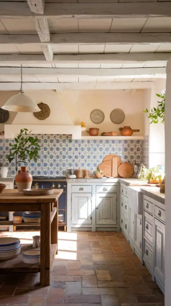 Blue accents are one of the easiest ways to bring that Mediterranean look to life. It can be something tiny like patterned tiles or something bold like a blue-painted island — but somehow the moment blue enters the room, everything feels brighter. Mix that with terracotta, wood, soft whites, and a few rustic touches, and suddenly you have a kitchen that feels like a Spanish cottage meets an Italian country farmhouse, even if you’re nowhere near the Mediterranean Sea.