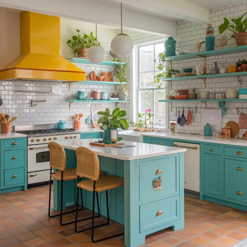 For balance, keep the walls and cabinets in soft neutrals like creamy white or pale stone. Add woven pendant lights or terracotta pots to warm up the cool tones. The overall effect feels like you’ve stepped into a European cottage — charming, cosy, and full of character.
