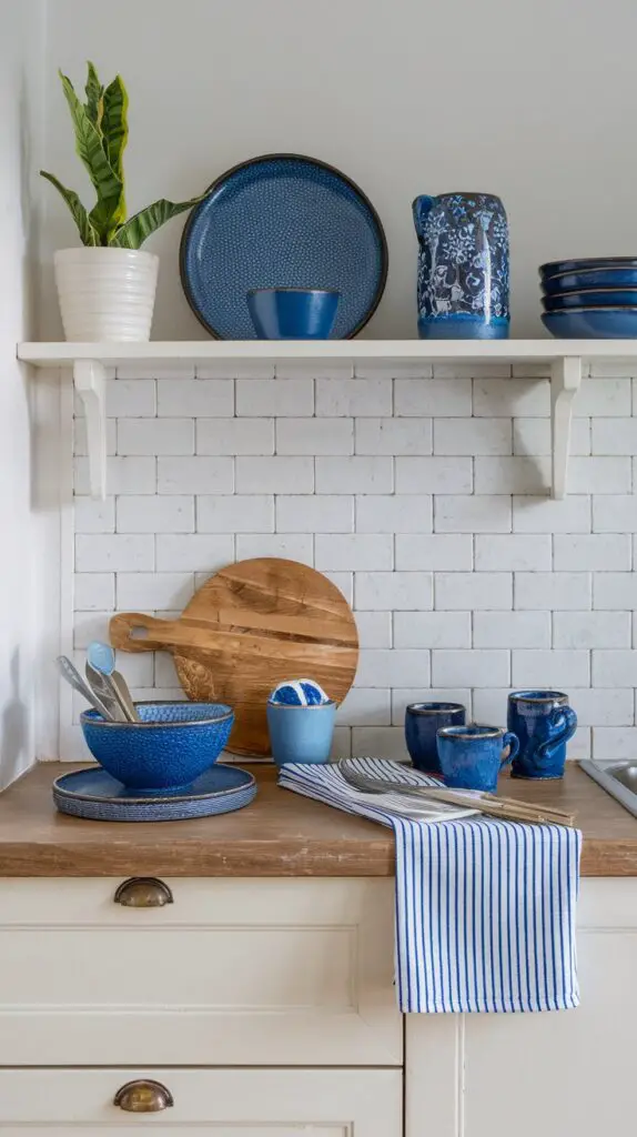 If you want Mediterranean style but you’re working with a small kitchen, bring in blue through decor rather than big fixtures. Try blue bowls, blue-striped kitchen towels, blue ceramic mugs, or a simple blue vase. These tiny accents create a pop of colour without overwhelming the kitchen layout. And the style is flexible — you can change it seasonally or mix in Spanish cottage or Italian farmhouse influences depending on your mood.
