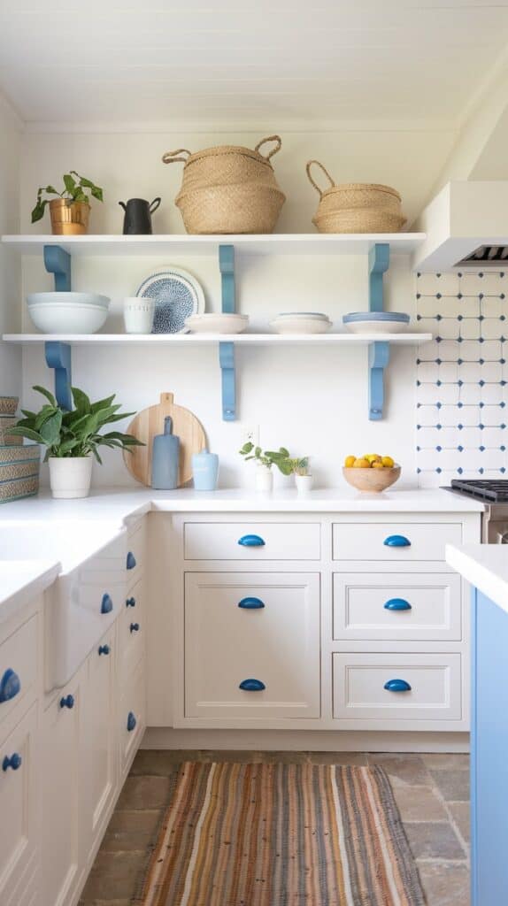 If you prefer a more subtle palette, start with fresh white cabinetry and add blue through the details — drawer pulls, painted trim, or even blue grout lines if you’re feeling a little adventurous. The combination feels bright and coastal, like something you’d see in a Mediterranean cottage kitchen.