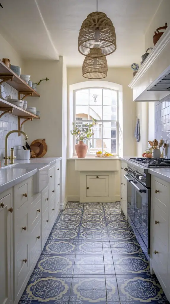 If you want something bold but still timeless, patterned floor tiles are the dream. Think floral prints, geometric patterns, or classic Mediterranean motifs in blue and white. They add charm, movement, and so much personality to a simple kitchen.