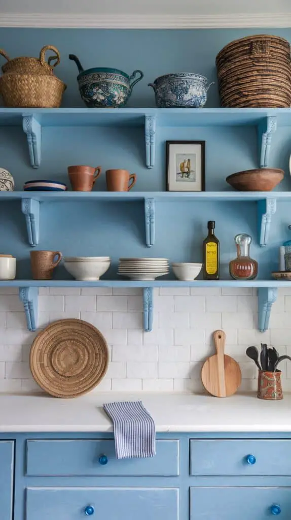 Open shelves are already a staple in Mediterranean interiors, but painting them blue makes them even prettier. Style them with everyday items like white plates, clay mugs, olive oil bottles, or woven baskets.